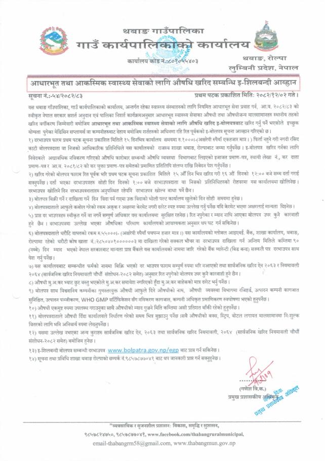 » आधारभूत तथा आकस्मिक स्वास्थ्य सेवाका लागि औषधि खरिद सम्बन्धी इ-शिलबन्दी आव्हान ।