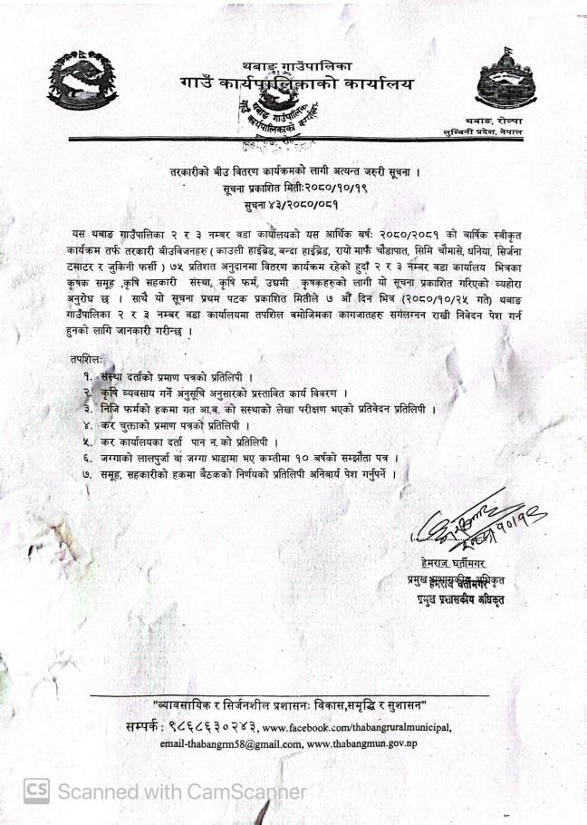 तरकारी विउ वितरण कार्यक्रमका लागि अत्यन्त जरुरी सूचना ।
