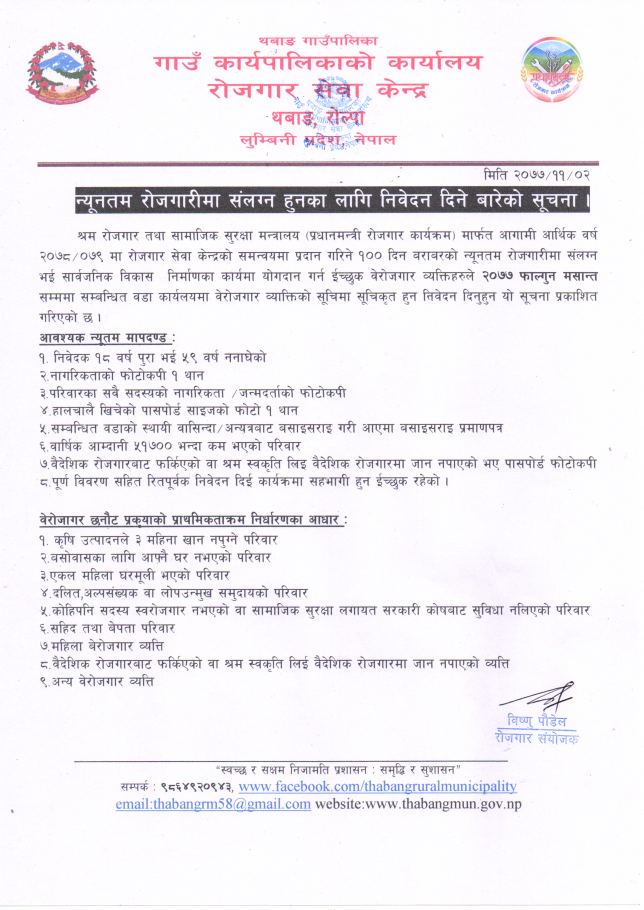 न्युनतम रोजगारीमा संलग्न हुनका लागि निवेदन दिने बारेमा सूचना ।
