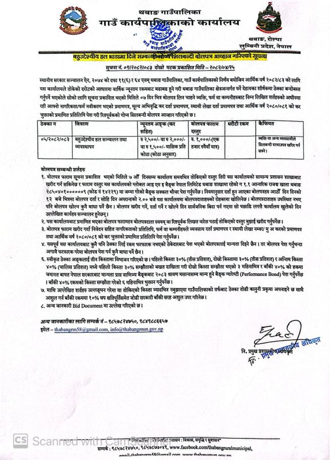 » बहुउद्देश्यीय हल भाडामा दिने सम्बन्धी गोप्य शिलबन्दी बोलपत्र आव्हान गरिएको सूचना ।