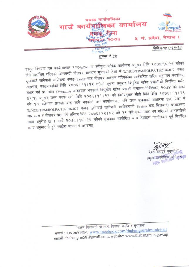 यस थबाङ गाउँपालिका कार्यलयबाट २०७६/७७ मा स्वीकृत वार्षिक कार्यक्रम अनुसार मिति २०७६/१०/२९ गतेका दिन प्रकाशित गरिएको शिलबन्दी बोलपत्र आव्हान सूचनाको ठेक्का नं W/NCB/TRM/ROLPA/11/2076-077 थबाङ ठूलोगाउँ खानेपानी आयोजना थबाङ-१ e-GP बाट बोलपत्र आव्हान गरिएकोमा सार्वजनिक खरिद अनुगमन कार्यालय, ताहाचल, काठमाण्डौको मिति २०७६।११।२२ गतेको सूचना अनुसार विद्युतिय खरिद प्रणालीको नियमित मर्मत संभार गर्न प्रणालीमा Downtime आवश्यक भएकाले विद्युतीय खरिद प्रणाली संचालन निर्देशिका, २०७४ को दफा ३१(१) अनुसार उक्त कार्यलयको मिति २०७६।११।२२ को निर्णयनुसार सोही मिति देखि २०७६।११।२९ गते १० बजेसम्म प्रणाली बन्द रहने भएकोले यस कार्यालयबाट पनि उक्त सूचनाको आधारमा उक्त ठेक्का नं W/NCB/TRM/ROLPA/11/2076-077 थबाङ ठूलोगाउँ खानेपानी आयोजनाको System बाट सिलबन्दी दरभाउपत्र, आशयपत्र र बोलपत्र पेश गर्ने अन्तिम मिति २०७६।१२।०२ गते १२ बजे सम्म म्याद थप गरिएको जानकारीको लागि अनुरोध छ । साथै २०७६।१०।२९ गतेको सूचनामा उल्लेखित अन्य ठेक्काहरु कार्यालयले पूर्व निर्धारित समय अनुसार नै हुने व्यहोरा जानकारी गराइन्छ ।