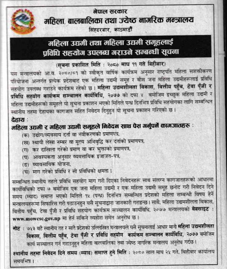 » महिला उद्यमी तथा महिला उद्यमी समूहलाई प्रविधि सहयोग उपलब्ध गराउने सम्बन्धी सूचना ।