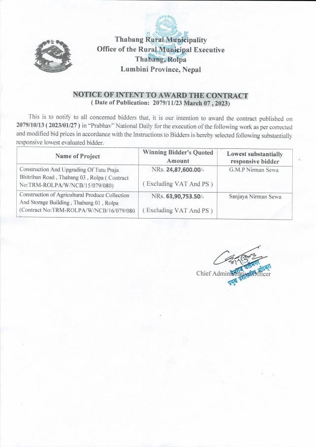 बोलपत्र स्वीकृत गरिएको सम्बन्धी आशयको सूचना ।