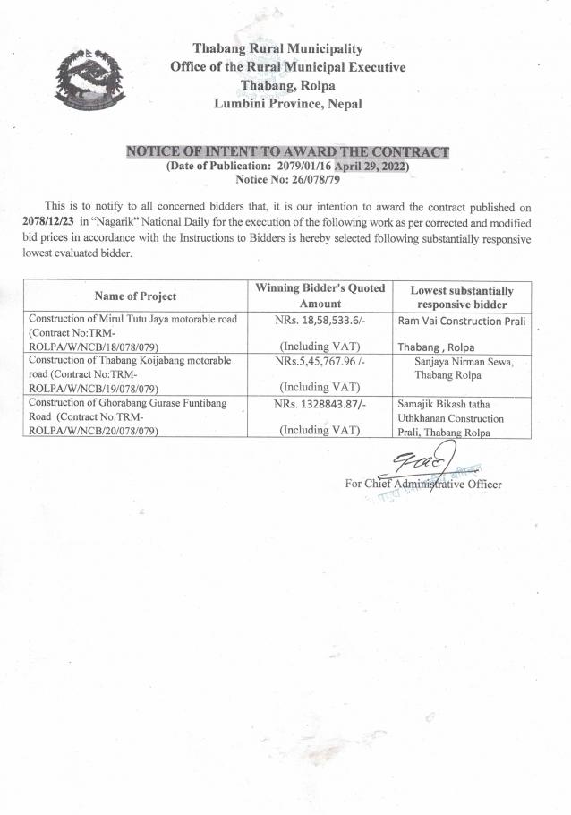 बोलपत्र स्वीकृत गरिएको सम्बन्धी आशयको सूचना ।