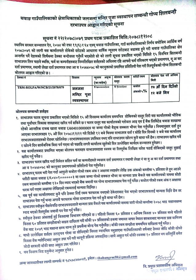 जलजला मन्दिर पुजा व्यवस्थापन सम्बन्धी गोप्य शिलबन्दी दरभाउपत्र आव्हान गरिएको सुचना ।